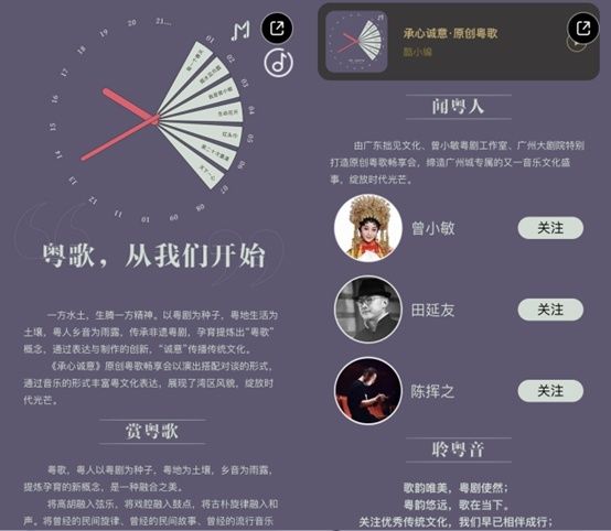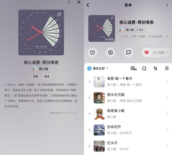 为了让“粤歌”这枝岭南文化的新芽被更多人看到与听到,广东拙见文化、曾小敏粤剧工作室、广州大剧院还跨界联合酷狗音乐,将这些粤歌上线酷狗,并共同推出“粤歌,从我们开始”为主题的粤歌企划专题及歌单,通过互联网助力粤歌传扬。